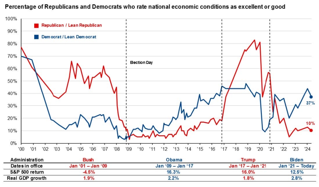Moreover, perceptions of economic conditions can be skewed by political preferences. A survey conducted regularly by the Pew Research Center on the state of the U.S. economy shows that those who identify as Republican rate the economy more favorably during a Republican presidency, while Democrats hold a favorable view under Democratic leadership, as shown in the chart below. Investors would have missed strong market returns if they stayed uninvested due to their partisan view. Yet, despite these large swings in economic perceptions, the U.S. economy has grown at an average rate of 2% through each administration. This highlights that markets and the economy are larger than politics. Consumer spending, which accounts for 68% of the economy, is the main engine. It also reassures that regardless of the promises made before the election, the actual implementation is often less pronounced due to the checks and balances of U.S. democracy.